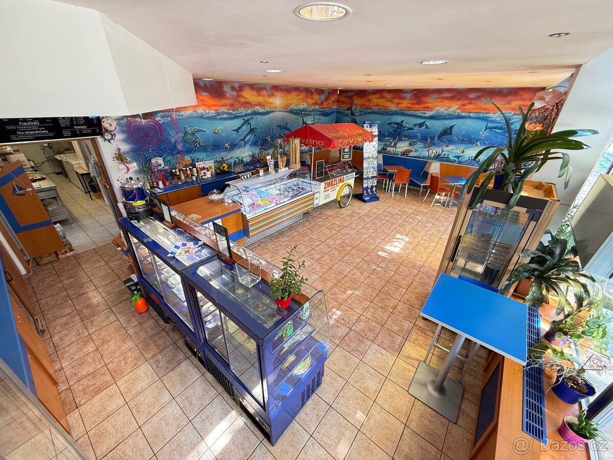 kompletně vybavený interiér – nábytek, vitríny na zákusky i zmrzlinu