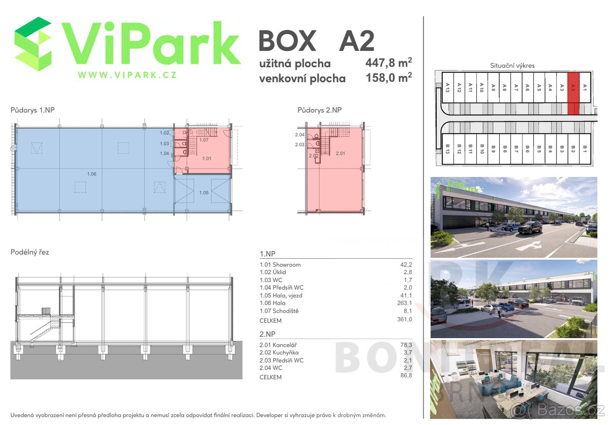 Areál se nachází v industriální zóně s perfektní dostupností jen pár minut od dálnice. Ideální pro firmy, které hledají reprezentativní zázemí pro skladování, výrobu či jiné podnikání. Příjezd kamionu je možný přímo k hale. Box disponuje: showroomem v 1.NP (42 m2), halou i s vjezdem (304 m2), kancelářskými prostory v 2.NP (78 m2), sociální zázemí v obou patrech, technickou místností přímo v hale, 5-7 vlastními parkovacími místy - 158 m2 celková venkovní plocha (rozměry jednotlivých boxů jsou maličko odlišné). Kolaudace prostor proběhla v červenci 2025 (boxy Bx) a v říjnu 2025 (boxy Ax).