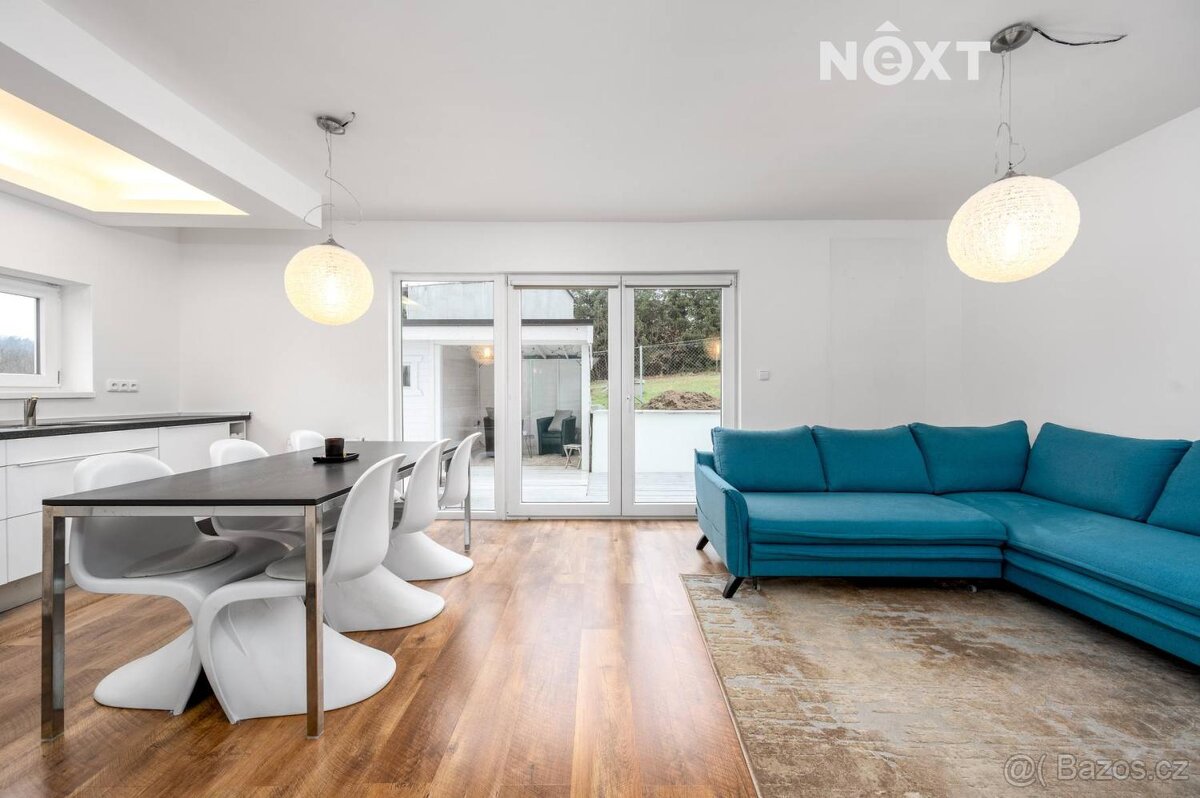 Přízemí: Dominantou je útulný obývací pokoj s přímým vstupem na terasu, propojený s minimalistickou bílou kuchyní vybavenou vestavnými spotřebiči a jídelní částí. V přízemí se dále nachází toaleta s designovou mozaikou a technická místnost s plynovým kotlem a úložným prostorem. Prakticky je využito i místo pod schodištěm jako komora.