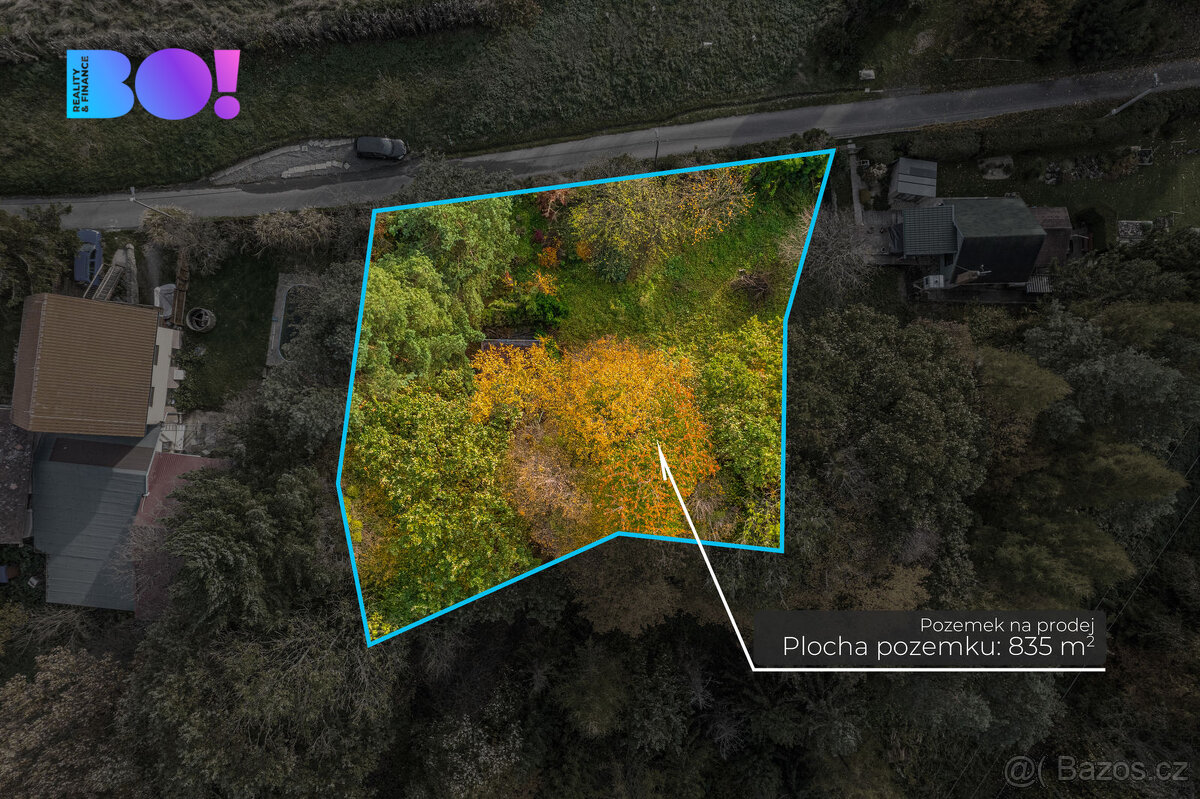 Místo zatím sloužilo jako zahrada. Stromy, vzrostlé okrasné keře, starší kůlna i oplocení potřebují údržbu, ale úpravou nebo jednoduchým odstraněním získáte zajímavý prostor. Pozemek je z jedné strany propojený s lesem a volným prostorem, z druhé strany s výhledem na pole a louky lemované pahorky.