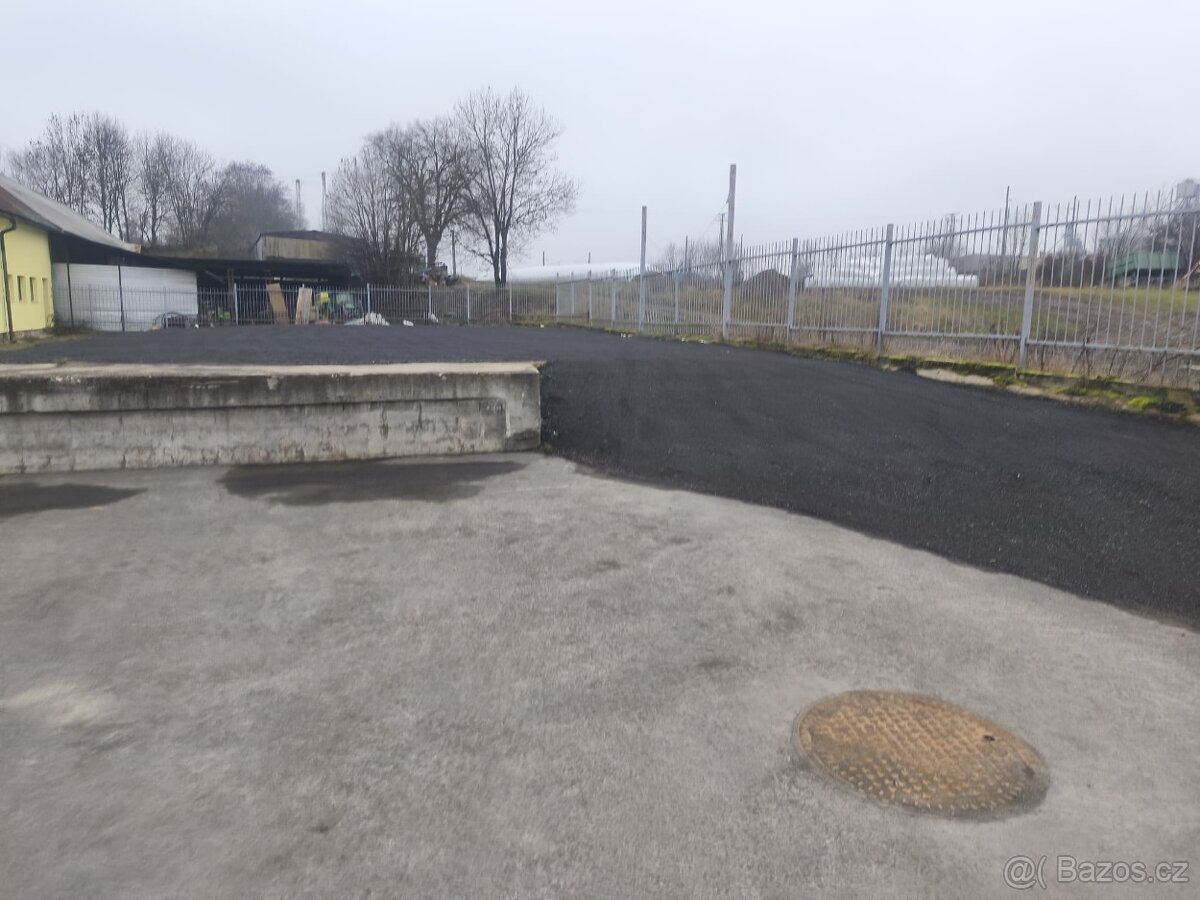 Pronájem cca 980 m2 zpevněné, oplocené plochy s vjezdovou, uzamykatelnou bránou. Pozemek s menším vyvýšením a točnou (viz foto).