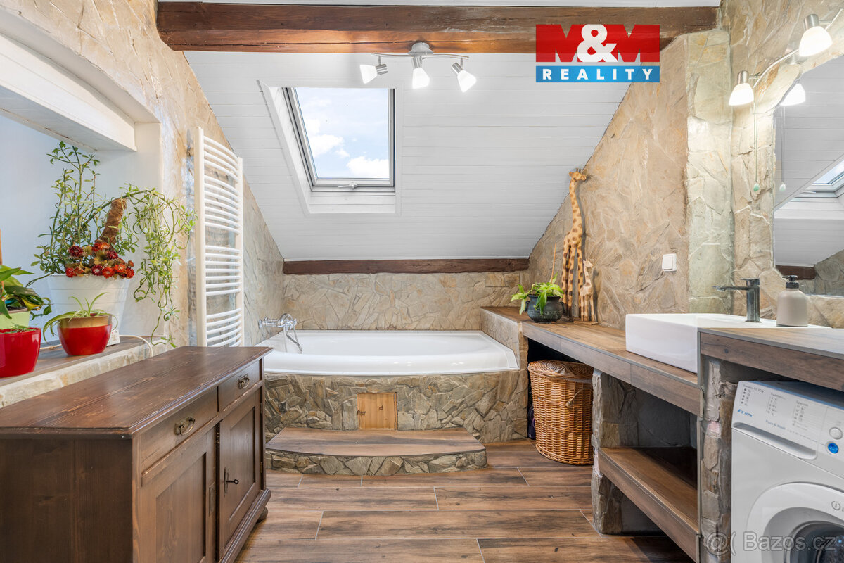 Součástí prodeje je i zahrada a prostorný sklep o výměře 11 m², garáž, zimní zahrada, dílna, menší prostor využívaný jako udírna. Celková atmosféra interiéru je velmi příjemná a nabízí dostatek místa pro rodinný život.