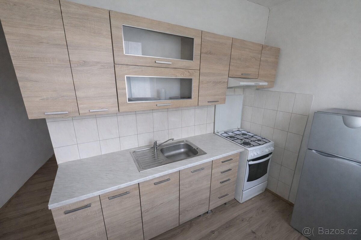 Kuchyň je vybavena kuchyňskou linkou s plynovými kamny. V koupelně je vana a skříňka se zrcadlem, WC odděleno.. Je zde původní umakartové jádro.