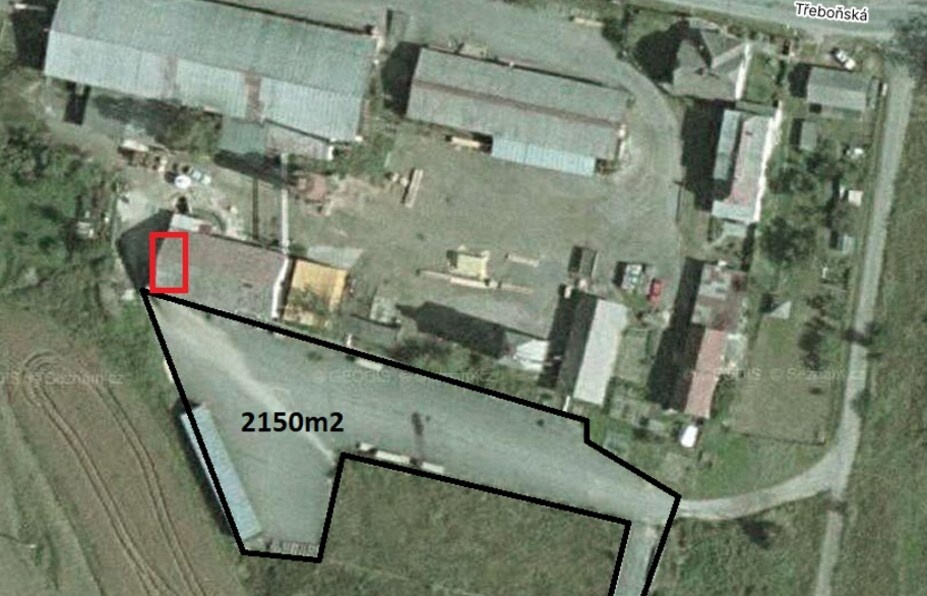 20.2.2026 - Nabízíme k pronájmu venkovní zpevněnou plochu o velikosti až 2100m2 vyznačenou černě. Možnost i dalších ploch až 10.000m2.