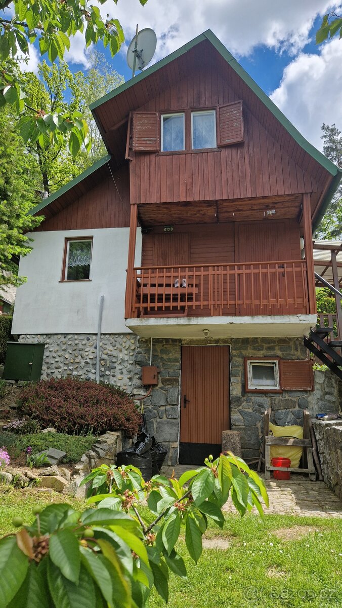 Nabízíme dlouhodobý pronájem dřevěno/zděné chaty s č.ev., v rekreační oblasti Nové Domky (Rapotín). Chata o velikosti užitné plochy 28 m2, se nachází na pozemku o výměře 387 m2. Do chaty je zavedena elektřina a je připojena na městkou vodu a kanalizaci. Vytápění je krbovými kamny na dřevo s výměníkem – bojler, radiátory. Chata je částečně vybavená. Po vstupu do chaty se nachází obývací pokoj, dále je zde kompletně zařízená kuchyně s plynovým čtyř plotýnkovým sporákem na pb lahev, lednicí a jídelním stolem se židlemi. V podkroví je pokoj vybavený postelemi. V koupelně se nachází sprchový kout a toaleta. Chata je částečně podsklepená. Přímo u chaty se nachází částečně krytá pergola s posezením. Na zahradě je několik ovocných stromů