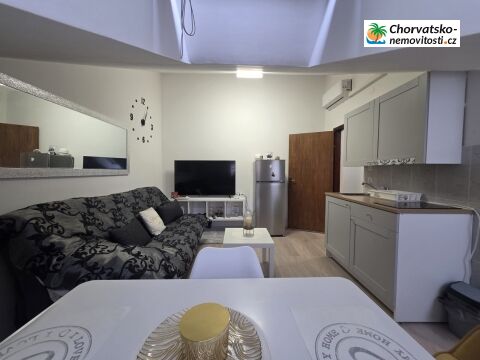 Dispozice zahrnuje ložnici, obývací pokoj, kuchyni, koupelnu a chodbu. Byt prošel rekonstrukcí v roce 2025 a je kompletně zařízený a klimatizovaný. Prodává se včetně vybavení, což umožňuje okamžité užívání bez nutnosti dalších investic.