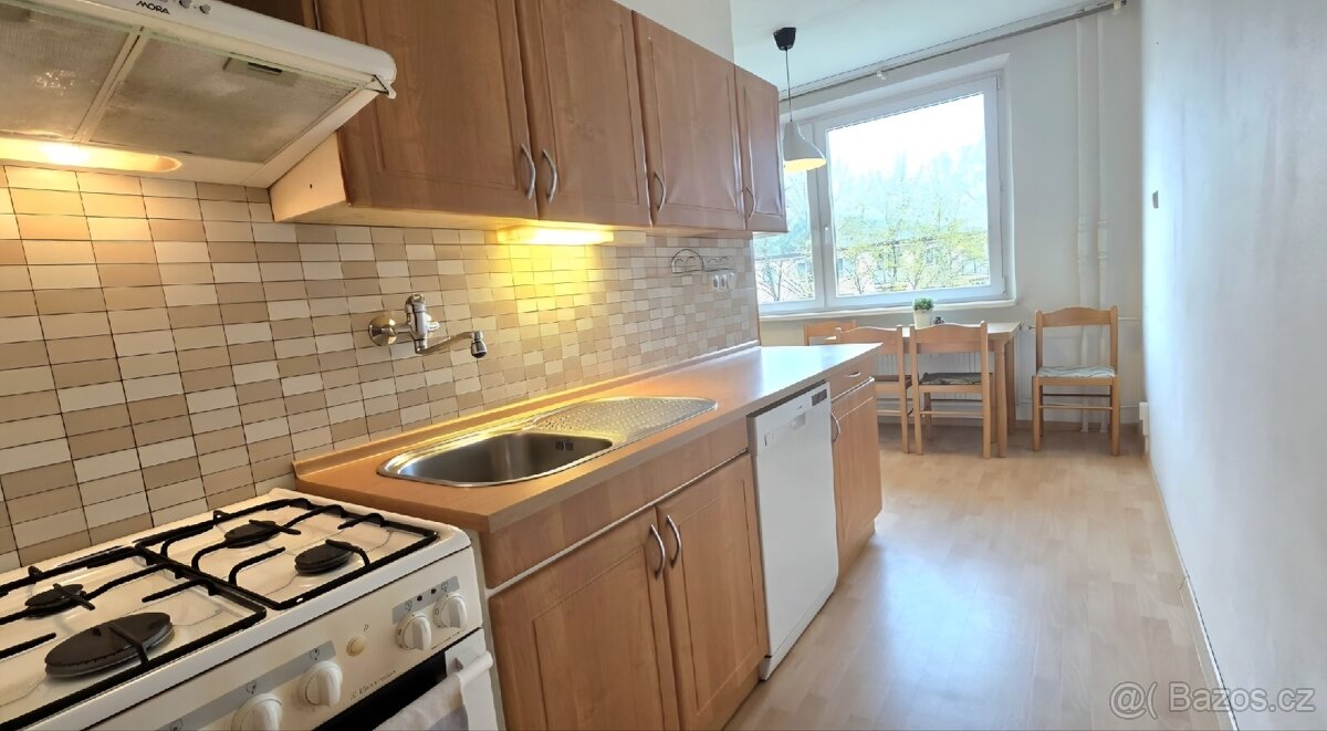 Součástí bytu je lino podlaha, zrekonstruovaná kuchyně s vestavnou myčkou, plynový sporák s elektrickou troubou, digestoří, lednicí s mrazákem, mikrovlnkou a rozkládacím stolem s židlemi. Samostatná koupelna s prostornou vanou, otopným žebříkem a pračkou. A samostatný záchod se sprškou.