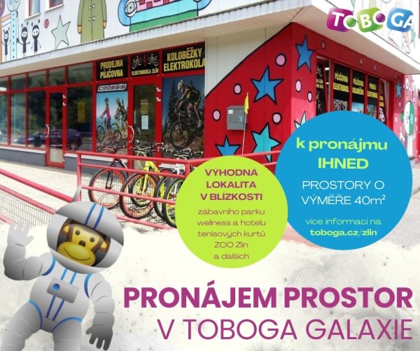 Nabízíme k pronájmu obchodní prostory o výměře 40m² v klidné části areálu Toboga Galaxie Zlín. Tyto prostory jsou díky své strategické poloze vedle zábavního parku, restaurace, tenisových kurtů a v blízkosti Zoo Zlín ideální například pro půjčovnu kol, koloběžek, prodej dětského, sportovního zboží. Možno také pronajmout jako kancelář či sídlo menší firmy.